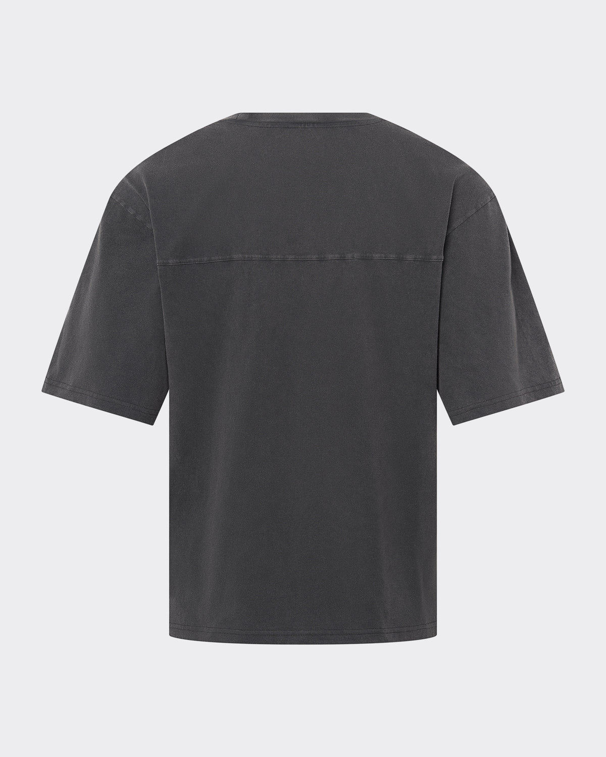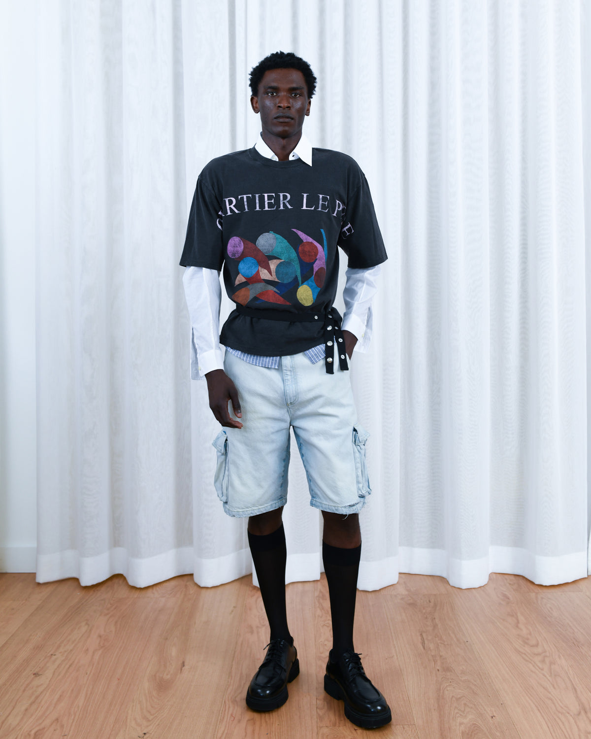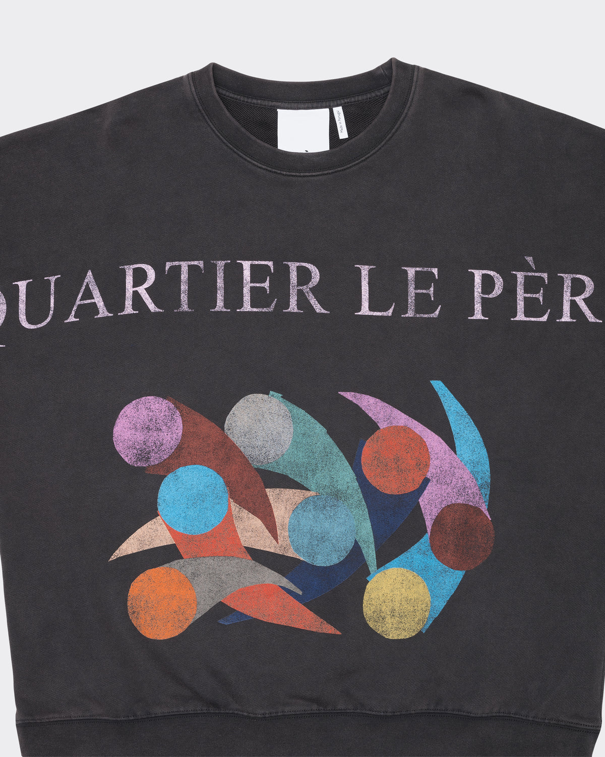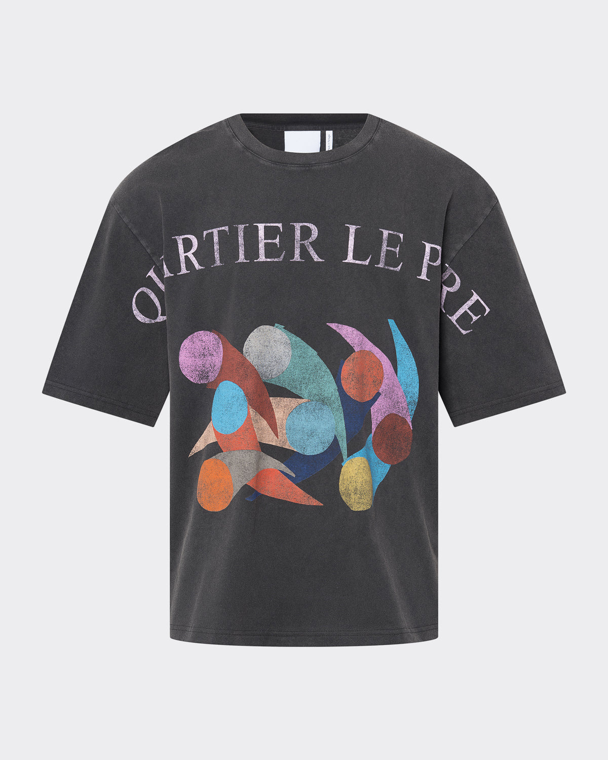 The Carrau Tee infuses artistic energy into a classic tee silhouette. Against a soft white, vintage-washed cotton backdrop, Antonio Carrau’s signature multicolor orbs seem to fly across the chest, capturing motion and vibrancy. Overlaid is a bold, distressed 'Quartier Le PÈRE' logo that enhances its edgy, streetwear appeal. With its intentionally oversized fit and lived-in finish, this Portuguese-made graphic t-shirt offers both comfort and a statement look. It's an effortless way to add an artful, urban flair to everyday wear.
