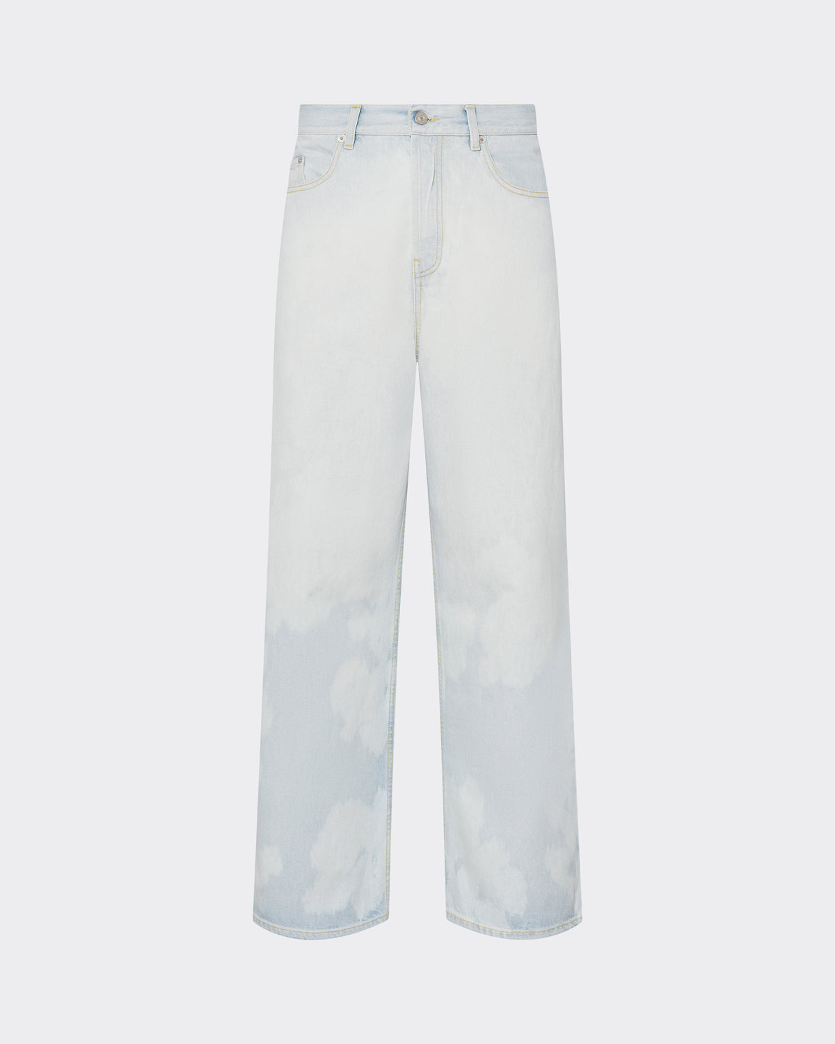 These light wash blue wide-leg jeans feature a dreamy cloud-like wash. The unique finish on these light blue jeans mimics a painted sky, giving the denim a soft, faded blue appearance with subtle white undertones.