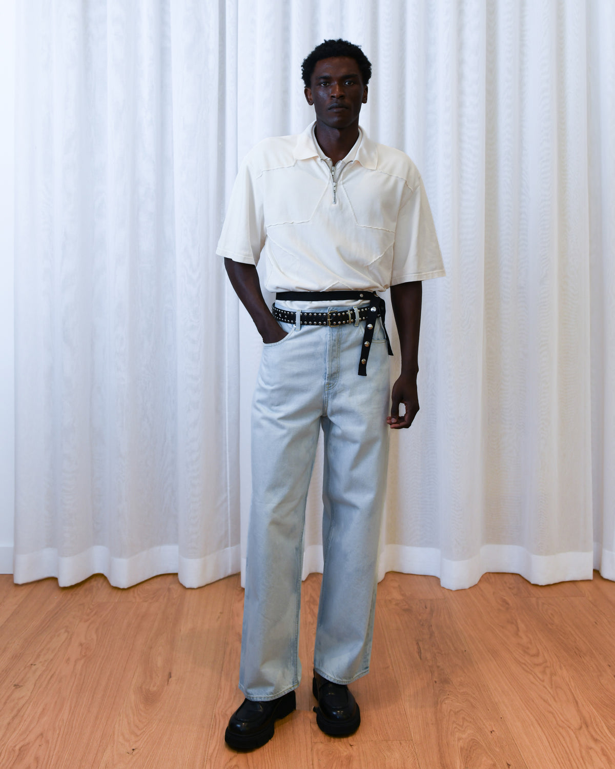 Cut in a contemporary wide-leg fit, this five-pocket light blue jeans drape loosely for a relaxed, fashion-forward look. A signature denim parallelogram patch accents the waistband on these light blue jeans. Made from premium Italian denim, this pair combines artisanal quality with an artistic wash.